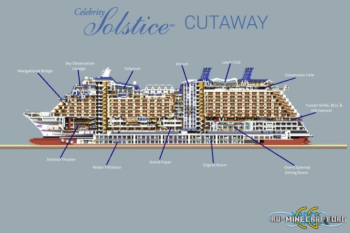 Карта под названием - Celebrity Solstice, представляет из себя замечательный круизный лайнер, над постройкой которого, автор явно приложил не мало усилий. Сам он выполнен очень качественно, и имеет все многие удобства для нахождения там. Выглядит он со стороны очень качественно, вам сможет понравиться.