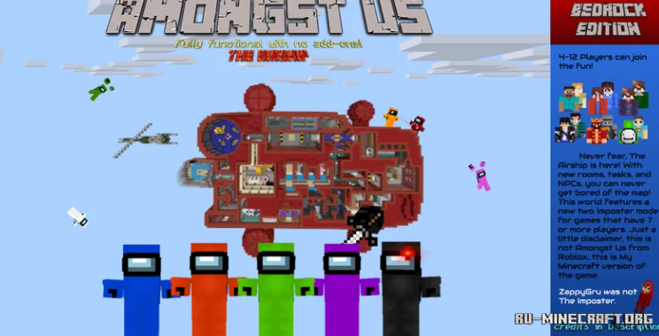 На карте под названием Amongst Us The Airship by ZappyGru вы сможете открыть для себя невероятные приключения в майнкрафте. Вас ожидает одна из карт на воздушном корабле из игры Amoung US. Весьма интересный вариант, если вы любите увлекательно провести собственное время вместе с вашими друзьями, вам точно понравиться...