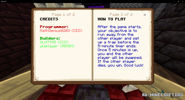 Интересная карта под названием IL Death Swap для вашего Minecraft PE клиента вашей игры, собственно это карта исключительно для двух игроков. Собственно каждый из игроков должен расставить ловушки, после свапа, проигрывает тот, кто попал во вражескую ловушку. Весьма интересная карта, подойдет для интересного времяпровождения...
