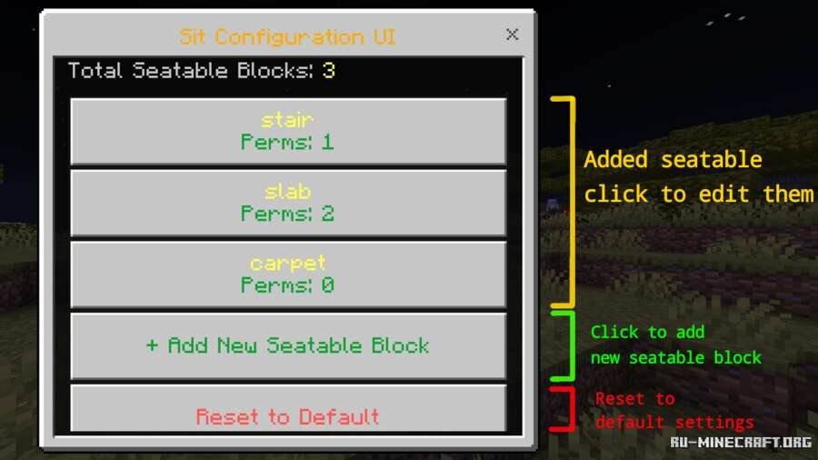 Представляем вашему вниманию отличное дополнение Настраиваемые сиденья для вашего Minecraft PE клиента вашей игры, вы сможете открыть для себя возможность садиться на любые предметы и блоки, для этого используете команду situi. Открывайте для себя отличные возможности в собственной игре, оцените бесплатно.