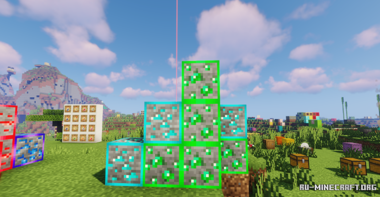 Представляем вашему вниманию неплохое обновление Glow Ores для вашего игрового клиента, вы сможете открыть для себя интересный вариант красивого выделения привычной руды, которая в свою очередь будет светиться в темноте, и иметь рамки. Довольно неплохой пакет, который в свою очередь открывает полезные визуальные улучшения.